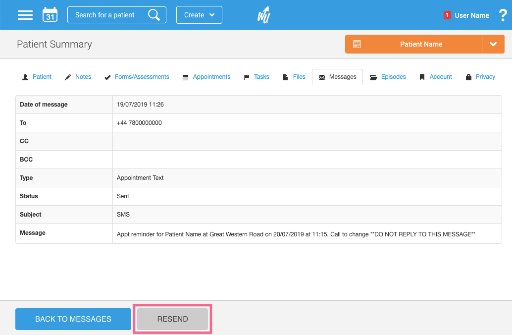 If a patient contacts you to advise that they have not received an appointment communication, but you can see the message listed on the Messages tab of the Patient Summary, then you can quickly and easily resend it to them from here.
