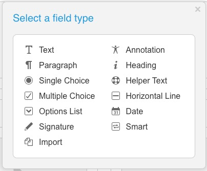 3. Within a section, you can then insert the fields that you require. Click the blue Add New Field + button within a section to insert a new field. The field types available to you will be listed, as below: