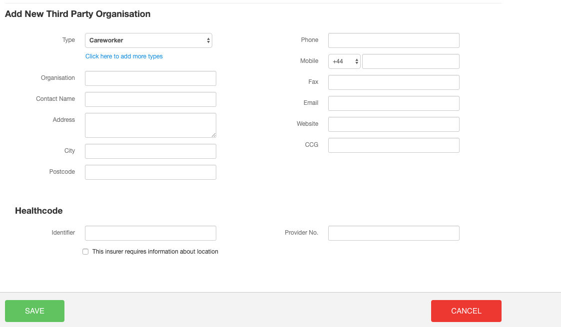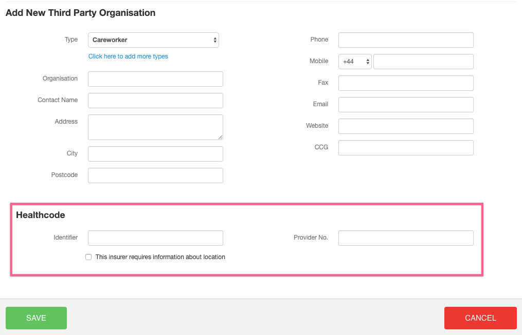 In addition to the regular information that you need to specify when you set up a Third-Party, you should enter the Healthcode Identifier for the Insurer, for example "bup" if you're invoicing BUPA, and your Provider Number for the Insurer: