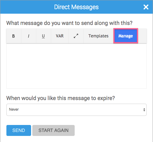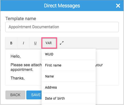 7. To insert variables into your message, select VAR and choose them from the dropdown list: