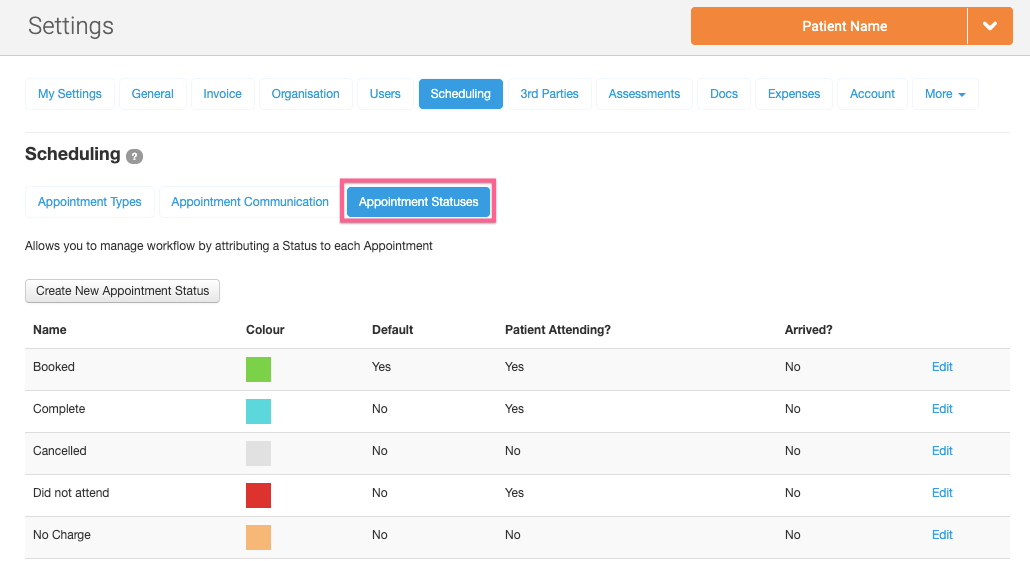 1. Go to Settings -> Scheduling and click on the Appointment Statuses tab: