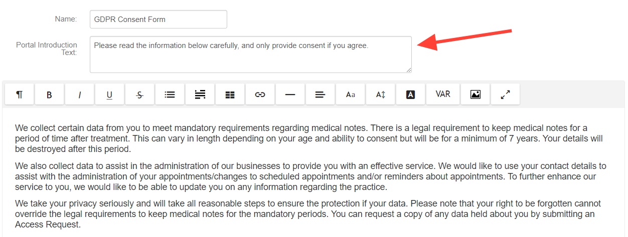You can choose to add some explanatory text to a consent form, which appears at the top of the portal when a patient is providing consent via email. To add this text, follow the steps below: