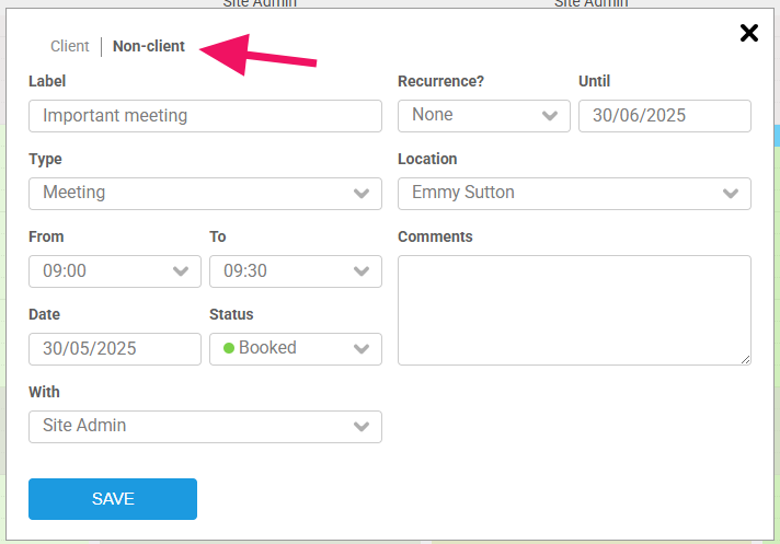 And then like this when you book it into the diary (remember to select 'Non-client' as shown below!):