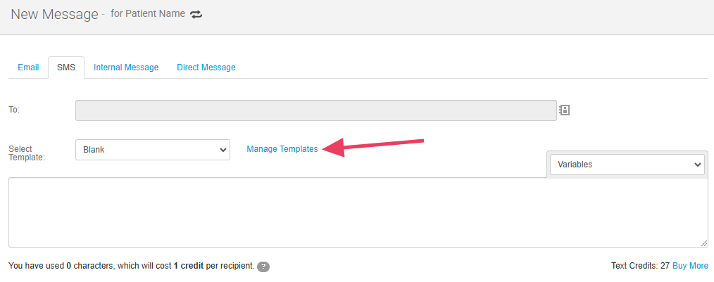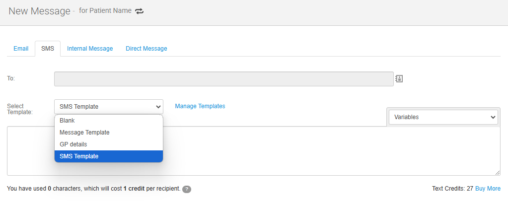 8. Now, when you go to Create -> Message -> SMS, you will be able to select this template from the dropdown: