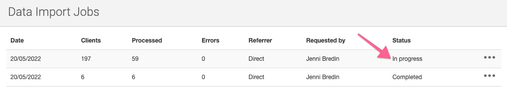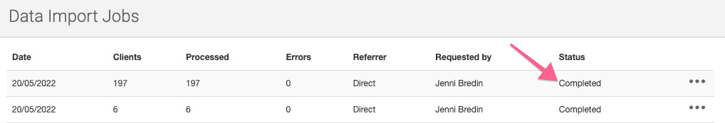 If you're only importing a few clients this shouldn't take long, but if you're importing several hundred records it might take a few minutes to complete and the status will change once it has:
