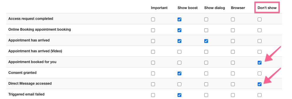 3. In the list of events, tick the box listed under the Don't show column for any notifications that you don't want to see:
