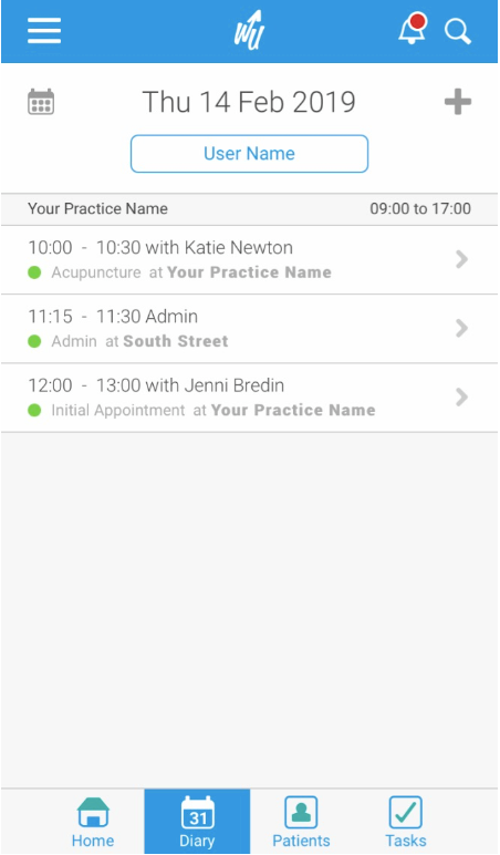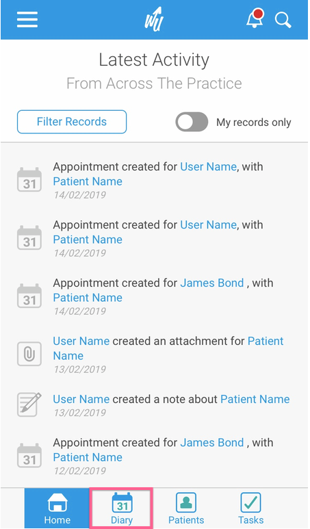1. Select the Diary icon from the bottom of the screen: