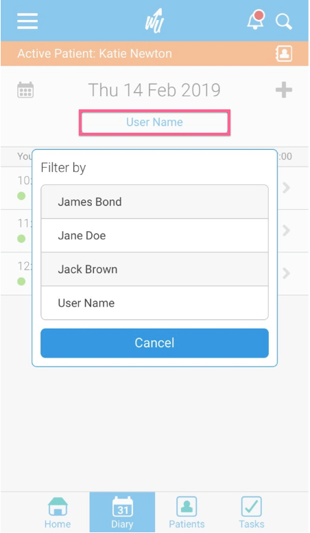 In the app view, you can only view one user's diary at a time. To change the diary you are viewing, simply click on the name at the top of the list and choose another user.