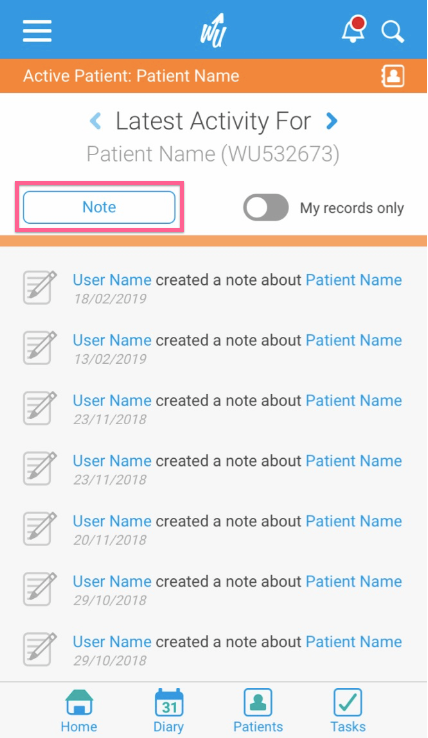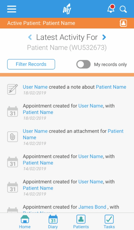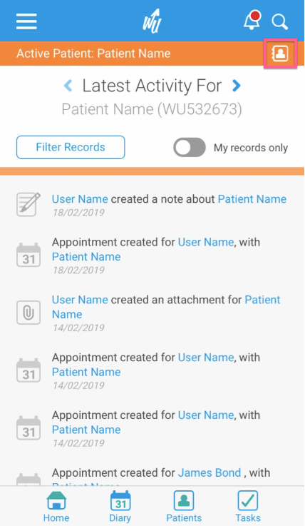 To access the patient summary, tap on the orange active patient bar. This will take you to the Latest Activity feed for the patient: