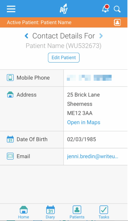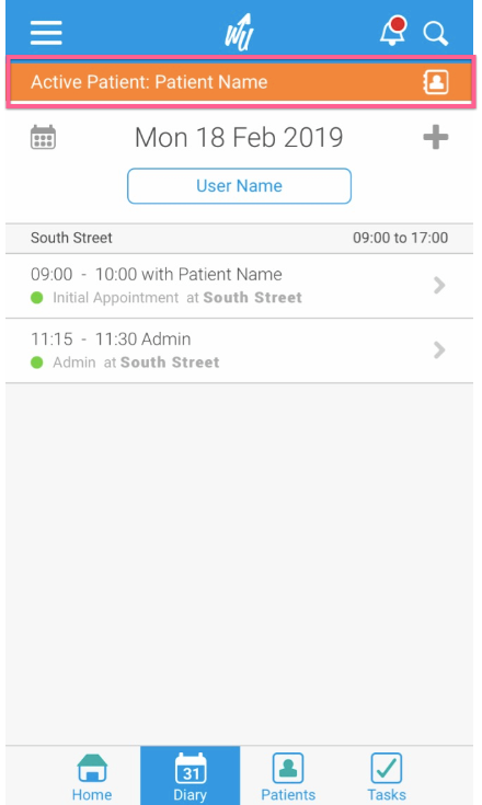 If you are using the WriteUpp app and would like to view the patient summary, you first need to ensure that you have the patient as your active patient. Your active patient is displayed in the orange bar across the screen:
