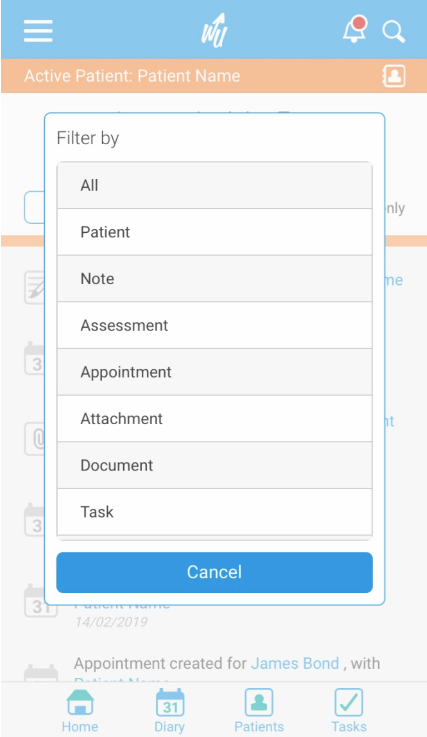 To view a particular type of file, as you would within the tabs of the patient summary on the web-based version of WriteUpp, tap on Filter Records to open a list of the available file types: