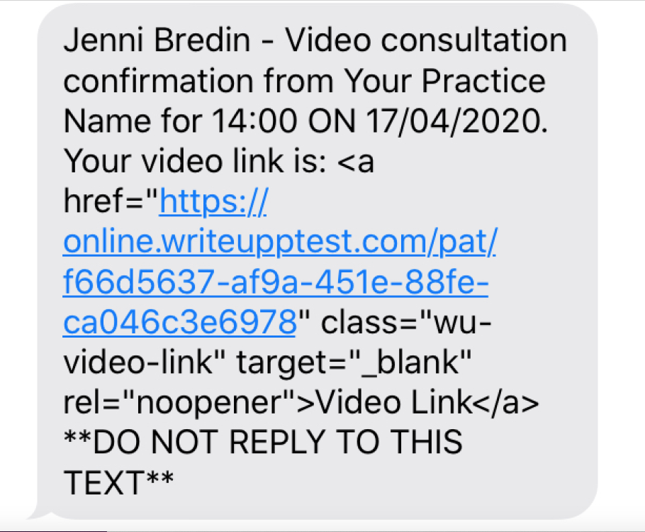 The default templates included with WriteUpp use the Next Appt Video variable in SMS messages, and the Next Appt Video Link variables in emails. If you create your own custom templates, be sure to use the correct format for the delivery method you choose!