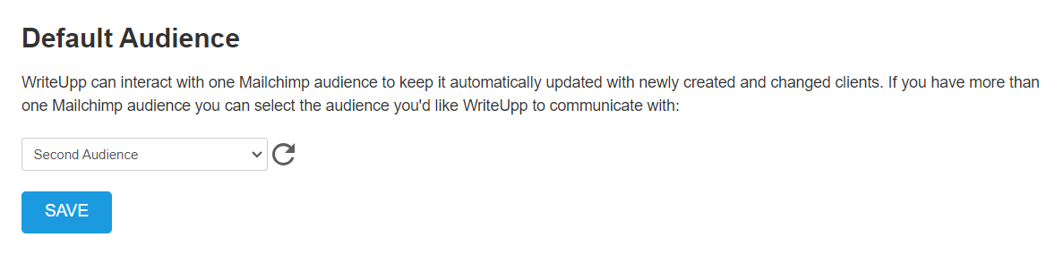 6. If you create a new audience in Mailchimp, which you would like to set as the default in WriteUpp, then please head to the Mailchimp integration page in WriteUpp and click the Refresh icon next to the Audience dropdown. This will update the audience list, so you can select the new audience as the default in WriteUpp. You must use the 'Refresh' icon to update the Audience list for any changes you make to your audiences in Mailchimp: