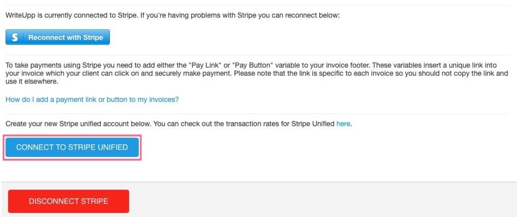To take advantage of the new partnership between WriteUpp and Stripe, which allows us to lower the previous transaction rates that were offered through WriteUpp, we'll need you to onboard a brand new Stripe account using a different connection. These accounts are called "Unified" accounts, whereas before they were "Standard" Accounts. As these are new Stripe accounts, Stripe's standard new account terms and conditions will apply. If you have any concerns about switching accounts, please do get in touch!