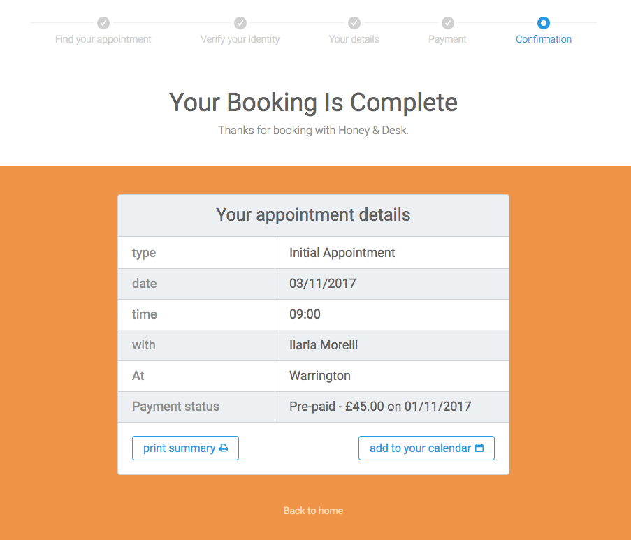 Here your client can see a summary of their booking, including the payment status if they have pre-paid They can also print the booking details and if they wish to do so, they can add the booking directly to their Outlook, Apple iCal or Google Calendars.
