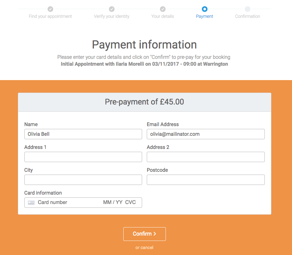 If you have pre-payment turned on, your client will be taken to the following screen where they will need to enter their payment details to confirm the booking.