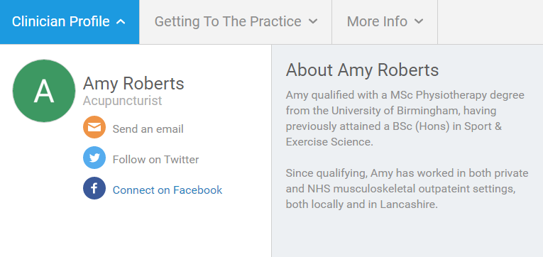 This will provide your client with a profile of the clinician, details on how to get to the practice (including a Google Map) and additional information about the appointment.