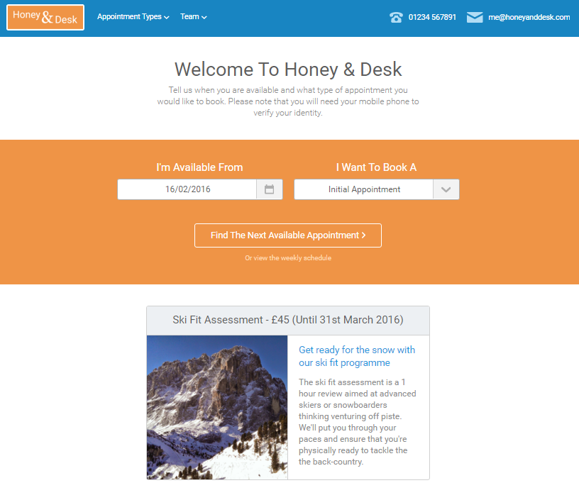 At the bottom of the screen, you'll see the optional promotional box that you can use to spread awareness about discounts or new treatments that you may be offering. Again, this is configured in the admin area (and if you don't want to use it, you don't have to!).