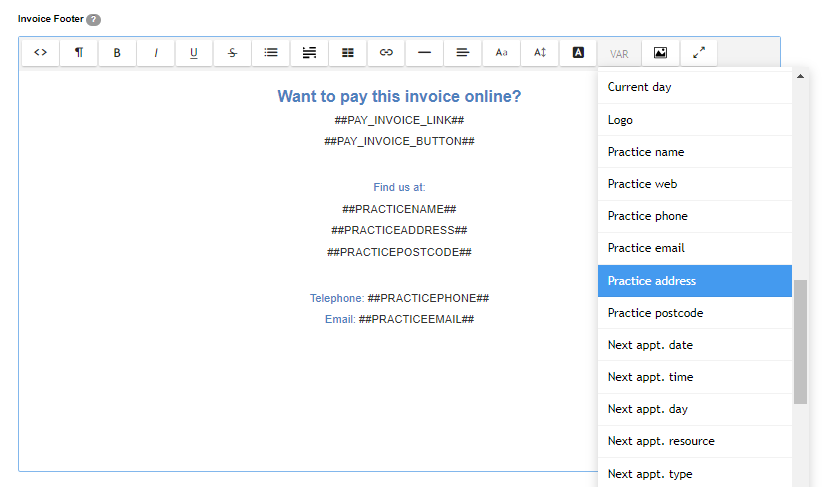 4. Use the VAR tool to add the 'Practice address' variable. This will then populate saved invoices with the Practive address you have entered under Settings -> Organisation. There are also variables for 'Practice name' and 'Practice postcode', so you can complete the whole address:
