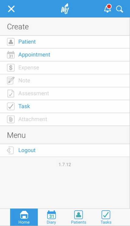 If you tap on the menu within the app and you can only select Patient, Appointment or Task from the menu options, you won't have an active patient selected: