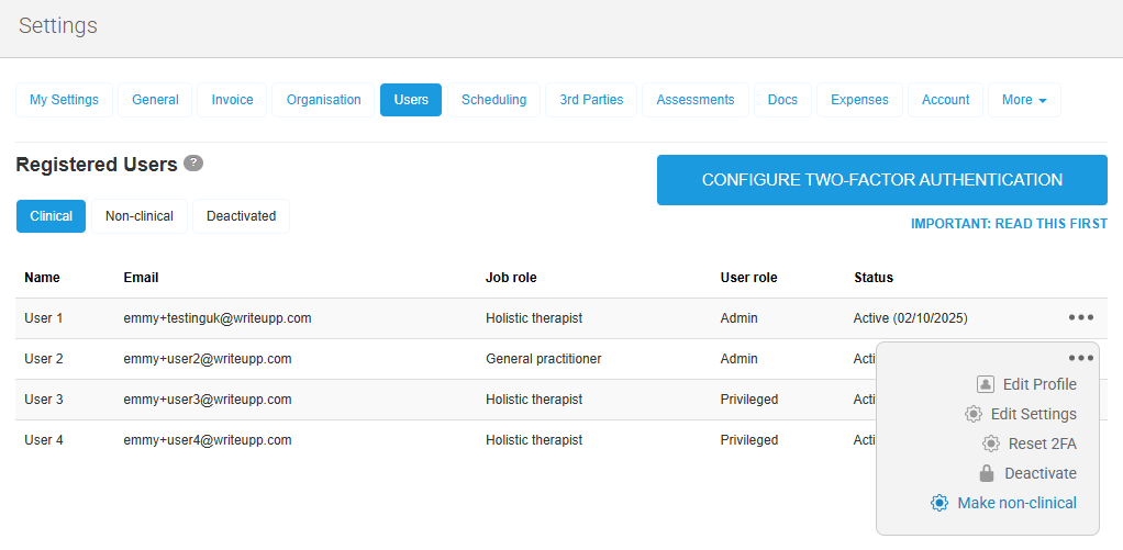• Clinical users are your clinicians who see patients. They require a diary in WriteUpp and can be booked for appointments.
